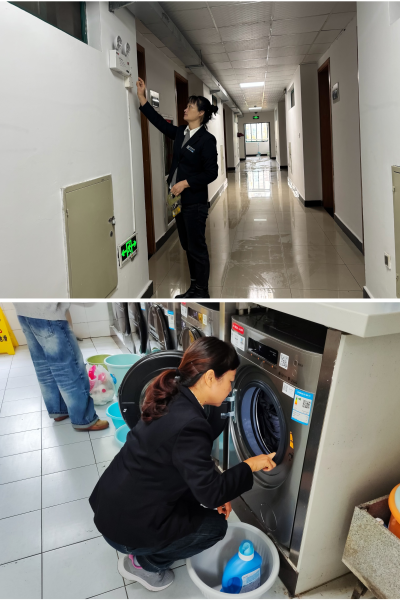 工作开展以来,宿管部精准发力、多点突破,构建起全方位的宿舍管理服务体系。一是开展宿舍设施设备“拉网式”排查,对水电设施、门窗家具等进行全面检查,建立问题台账并实行“销号式”管理,明确整改时限与责任人,确保隐患及时清零;二是深化宿舍环境专项整治,聚焦宿舍门厅墙壁污渍清理、垃圾分类点周边卫生保洁等重点环节,细化清洁标准,全面提升宿舍区域环境整洁度;三是创新服务引导形式,精心制作并投放“宿管阿姨小课堂”洗衣指南系列视频,以通俗易懂的方式讲解洗衣机规范使用方法,引导学生养成文明用物的良好习惯。